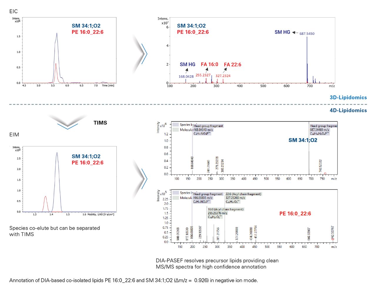 TIMS-enhancement enables resolution of isomers, isobars and interferences, reducing the incidence of chimeric MS/MS spectra for high-confidence automated annotation. Lipid and metabolite annotation benefits from clean MS/MS spectra, especially in automated downstream workflows utilising spectral libraries and in-silico fragmentation (4D-Metabolomics™) and rule-based annotation (4D-Lipidomics™). Here, co-eluting and co-isolated lipid species, measured using dia-PASEF® 4D-Lipidomics™, are mobility separated, producing distinctive and characteristic MS/MS fragmentation spectra for each. These cleaned spectra form the cornerstone of accurate annotation, interpretation and reporting.