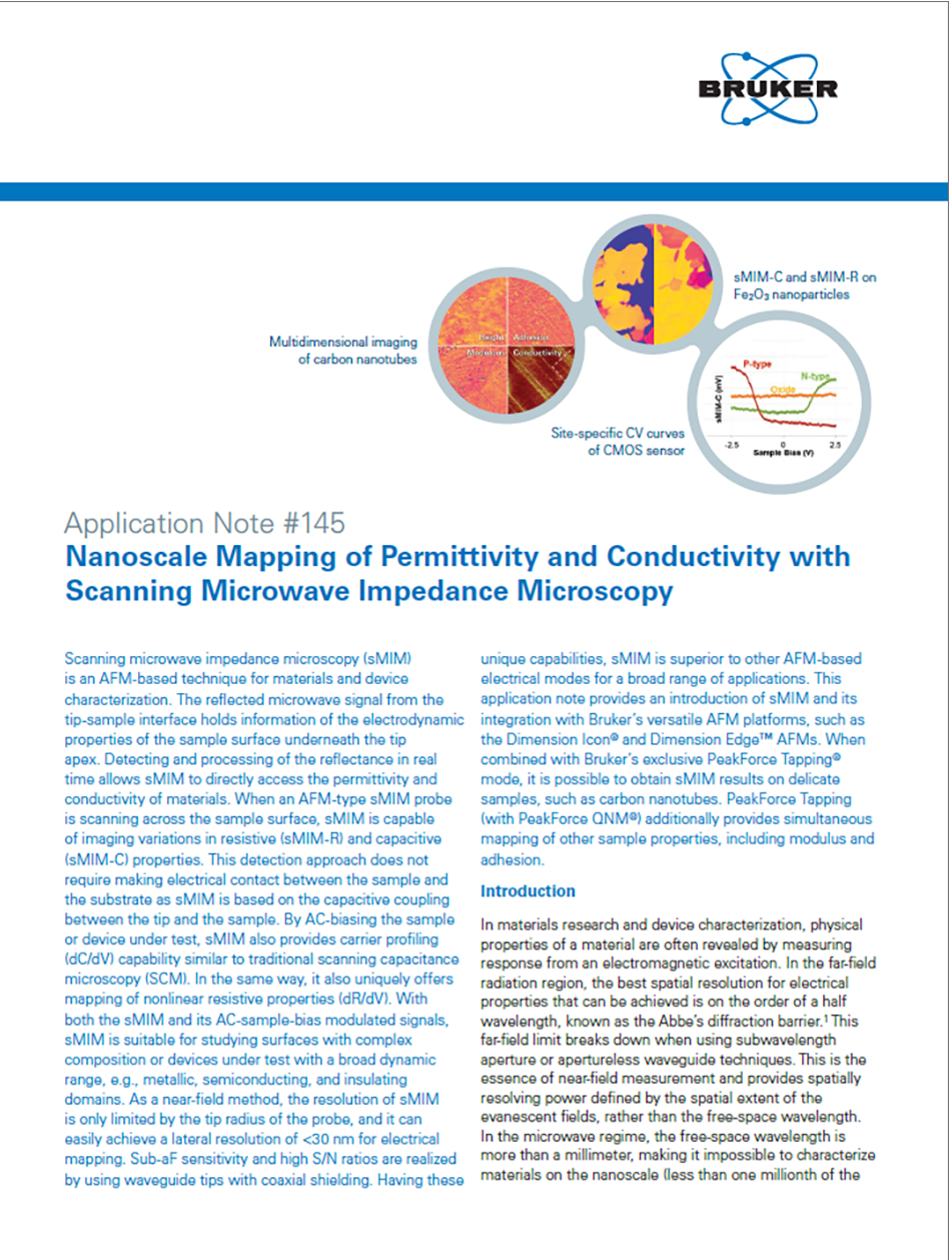 This application note provides an introduction of sMIM and its integration with Bruker’s versatile AFM platforms, such as the Dimension Icon® and Dimension Edge™ AFMs. When combined with Bruker’s exclusive PeakForce Tapping® mode, it is possible to obtain sMIM results on delicate samples, such as carbon nanotubes. PeakForce Tapping (with PeakForce QNM®) additionally provides simultaneous mapping of other sample properties, including modulus and adhesion.