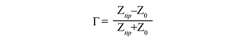 In a typical sMIM system, a matching network allows for the transmission of a low-power 3 GHz signal to the apex of the tip. This electronics output is set by default at -20 dBm and can be varied from -10 to -40 dBm. The optimal frequency often has a slight deviation (few to tens of MHz) from the 3 GHz due to the variation of individual probe characteristics, and is selected to minimize the reflectance (Γ) from the probe and probe interface assembly. When the tip is engaged and scanning across the sample surface, sMIM detects the reflected microwave signals due to a variation in the system impedance from Z0:
