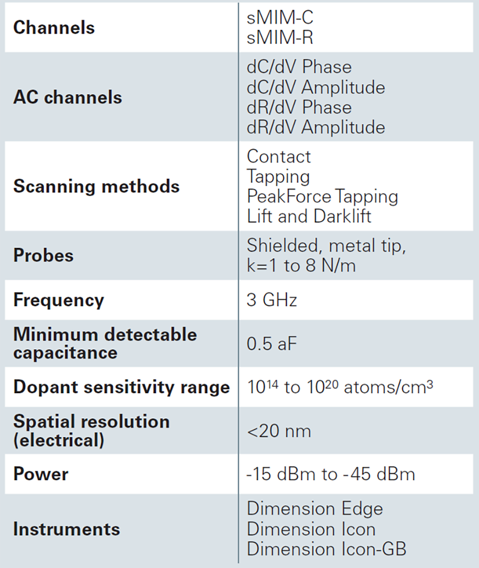 In summary, sMIM is a promising technique for charactering material electrical properties, such as permittivity and conductivity. Integrated with the precise topographic imaging capabilities of atomic force microscopy, the function of materials and devices can be probed with <20 nm resolution, adding new dimensions of information that directly correlate to the topographic channel. Importantly, this type of measurement of material electrodynamic properties does not require electrical contact with the substrate. This frees researchers and engineers from the tedious work of wiring and soldering that might alter the sample electrical properties and be impossible for nanoscale materials. Leveraging Bruker’s versatile AFM platforms, not only can the capacitive and resistive properties be imaged, but the AC components resulting from the modulation of sample bias are scanned and resolved for dC/dV-type semiconductor carrier profiling and also add unique information from the dR/ dV analysis. In addition, site-specific capacitance-voltage and resistance-voltage spectroscopy adds new tools for device failure analysis and for fundamental studies of novel materials. Finally, when empowered by Bruker’s unique PeakForce Tapping, sMIM greatly expands its applications to previously challenging measurements on fragile samples and also provides simultaneous mapping of correlated mechanical properties. The ability to directly image the local variation of a sample at the tens of nanometer length scales of sMIM has stimulated new areas of research and applications. CNTs, nanoparticle oxide films, subsurface patterns, and a variety of semiconductor devices discussed in this application note are just some of the examples. The versatility of sMIM leveraging Bruker’s advanced AFM platforms will empower material researchers and device engineers to explore basic principles underlying functionality and perform more advanced and complete materials characterization and device failure analysis.