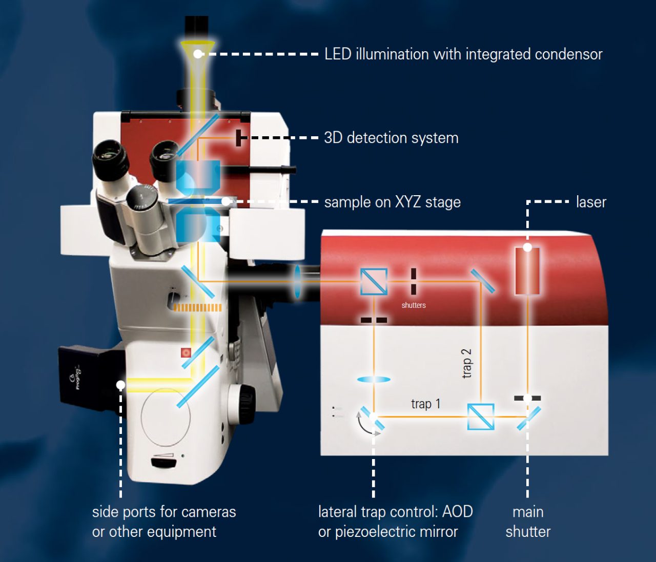 The highly stable trapping beam in single and double-beam configurations allows flexible and precise sample manipulations. Fast acousto-optic deflectors (AODs) and a laser-time-sharing principle enable multiplexing and demultiplexing setups, for advanced experiments and precise control of multimolecular complexes.