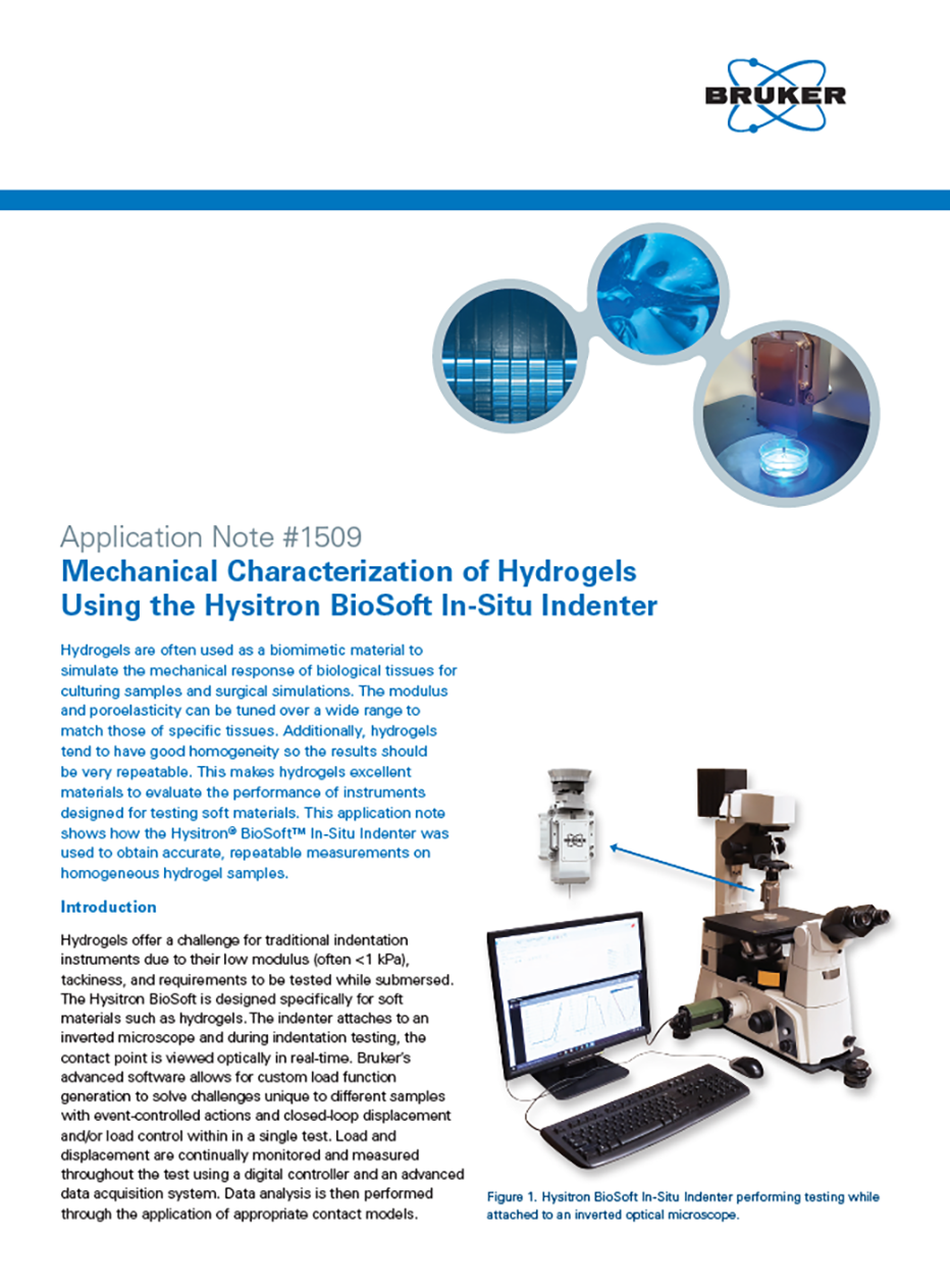 Hydrogels are often used as a biomimetic material to simulate the mechanical response of biological tissues for culturing samples and surgical simulations. The modulus and poroelasticity can be tuned over a wide range to match those of specific tissues. Additionally, hydrogels tend to have good homogeneity so the results should be very repeatable. This makes hydrogels excellent materials to evaluate the performance of instruments designed for testing soft materials. This application note shows how the Hysitron® BioSoft™ In-Situ Indenter was used to obtain accurate, repeatable measurements on homogeneous hydrogel samples.