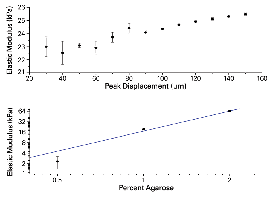 Figure 4 shows the elastic modulus results for polyacrylamide and agarose. The elastic modulus climbs with the peak displacement. Analyzing the low displacements (=60 µm), the elastic modulus was determined to be 22.9±0.6 kPa. The elastic moduli of 0.5%, 1%, and 2% agarose were determined to be 2.29±0.9 kPa, 19.2±1.2 kPa, and 64.4±1.2 kPa respectively (Figure 4). A power law fit gives a power exponent of 1.92±0.26, which is expected for hydrogels.2 These results show that the Hysitron BioSoft In-Situ Indenter can be used to perform accurate and repeatable indentation measurements on soft hydrogel samples.