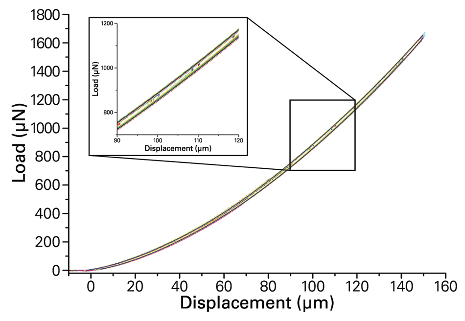 Polyacrylamide: The elastic modulus of a 500 µm thick polyacrylamide gel sample was measured as a function of depth. A total of 55 individual tests were performed. An overlay of the curves shows that the repeatability of the tests was excellent (see Figure 2).
