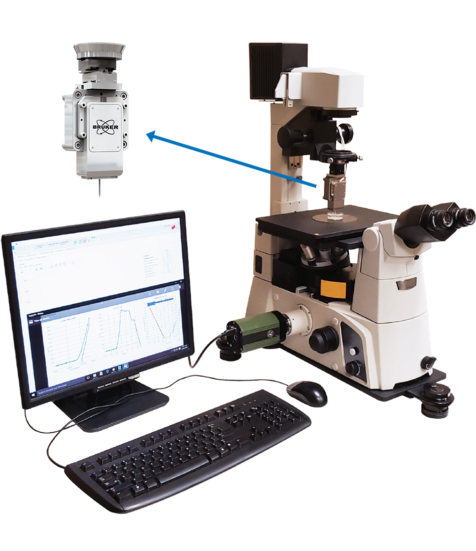 Hydrogels offer a challenge for traditional indentation instruments due to their low modulus (often <1 kPa), tackiness, and requirements to be tested while submersed. The Hysitron BioSoft is designed specifically for soft materials such as hydrogels. The indenter attaches to an inverted microscope and during indentation testing, the contact point is viewed optically in real-time. Bruker’s advanced software allows for custom load function generation to solve challenges unique to different samples with event-controlled actions and closed-loop displacement and/or load control within in a single test. Load and displacement are continually monitored and measured throughout the test using a digital controller and an advanced data acquisition system. Data analysis is then performed through the application of appropriate contact models.