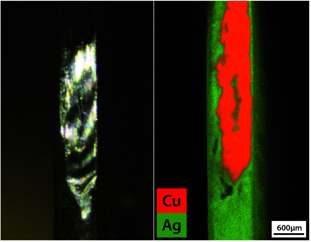 To test this hypothesis, a small edge of the coin was polished to allow access beneath the coin exterior, and new X-ray maps and point analyses collected. The micro-XRF map collected using the M4 TORNADO revealed the presence of a Cu-rich core, significantly poorer in Ag. Point analyses determined the true composition of the coin to be ~35% Ag, within the expected compositional range for Roman denarii of this time. The compositional values determined for the surface of the coin are therefore considered disturbed, likely due to a relative enrichment of noble elements (in this case Ag) at the surface due to depletion of the more mobile base metal (copper).