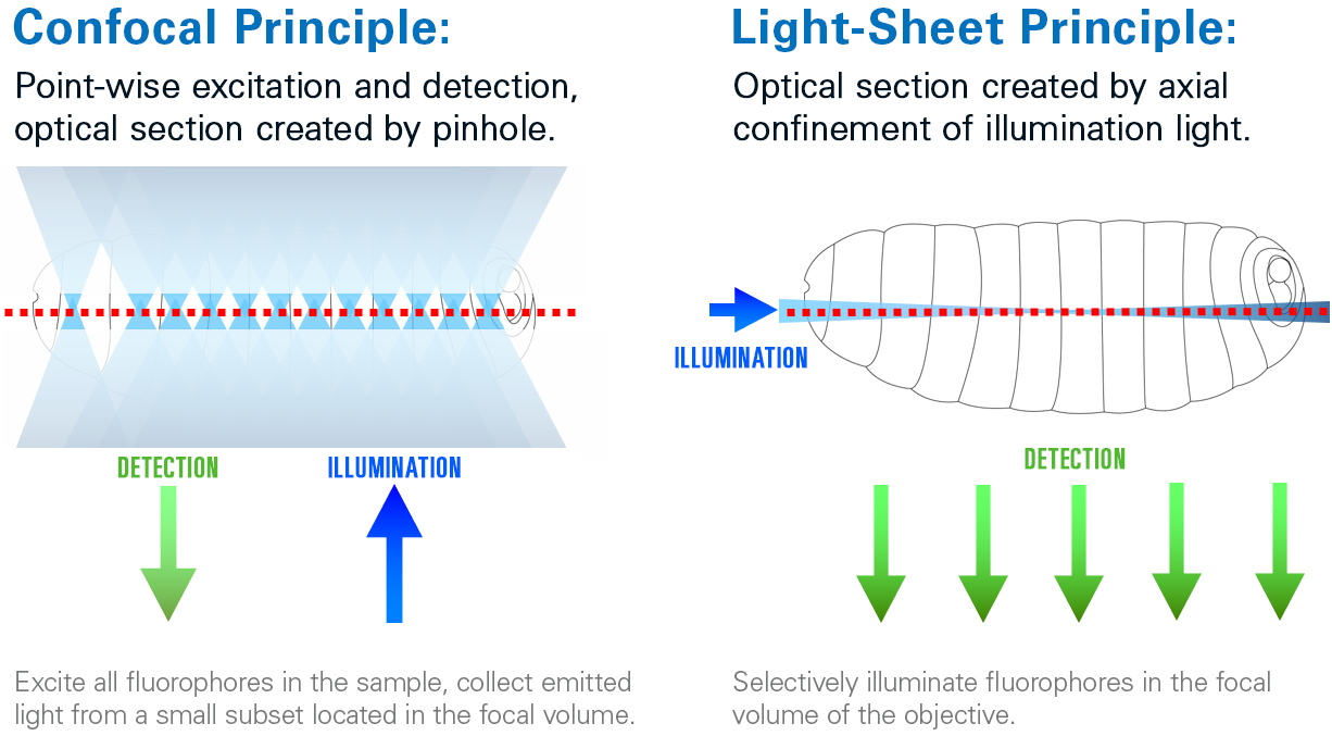 A particular strength of these model organisms is the ability to study embryonic development in vivo through the use of long-term timelapse imaging. This allows researchers to visualize cells in their native 3D environment and translate these studies of cellular dynamics to the organismal level. However, imaging studies of these large and sensitive specimens have traditionally been plagued by photobleaching and phototoxicity. Conventional imaging techniques, such as laser-scanning and spinning disk confocal microscopy, excite fluorophores above and below the focal place of interest and create optical sections by way of a pinhole (or disk of pinholes) placed in a conjugate focal plane which function to physically block light from out-of-focus planes from making it to the detector. This means with every image acquired, every fluorophore in the path of the laser beam becomes excited, even if it does not contribute to the final image. When a fluorescent protein is excited, it has the potential to enter a triplet state and photobleach or react with molecular O2 and produce free radials that can damage the cell, leading to cell death; also known as phototoxicity. These effects become particularly apparent during long-term timelapse studies where researchers commonly will photobleach their protein of interest or the embryo will arrest or die due to repeated exposure of high intensity excitation light.