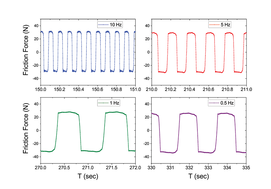 The presented setup/rig has been designed with unprecedented flexibility, and not exclusively for protocols. It allows researchers to perform measurements at different conditions, which is essential in understanding performance differences of lubricants at different regimes. The TriboLab’s reciprocating stage can move at very slow speeds of 0.01 Hz and below, as well as at speeds as high as 60 Hz. At high speeds, the piezoelectric-based force sensor does not drain the current, and the sensor is able to precisely record quasi-static or very slow-motion systems. The normal force that can be applied is likewise flexible due to TriboLab’s selection of 11 distinct sensors covering ranges between a few millinewtons to kilonewtons. The variable stroke is capable from 10s of microns to 25 mm. Figure 7 presents the quality of the data capture by the piezoelectric-based sensor for tests conducted at different speeds, illustrating how the test can be conducted to understand mechanical and tribochemical events occurring in very different regimes.