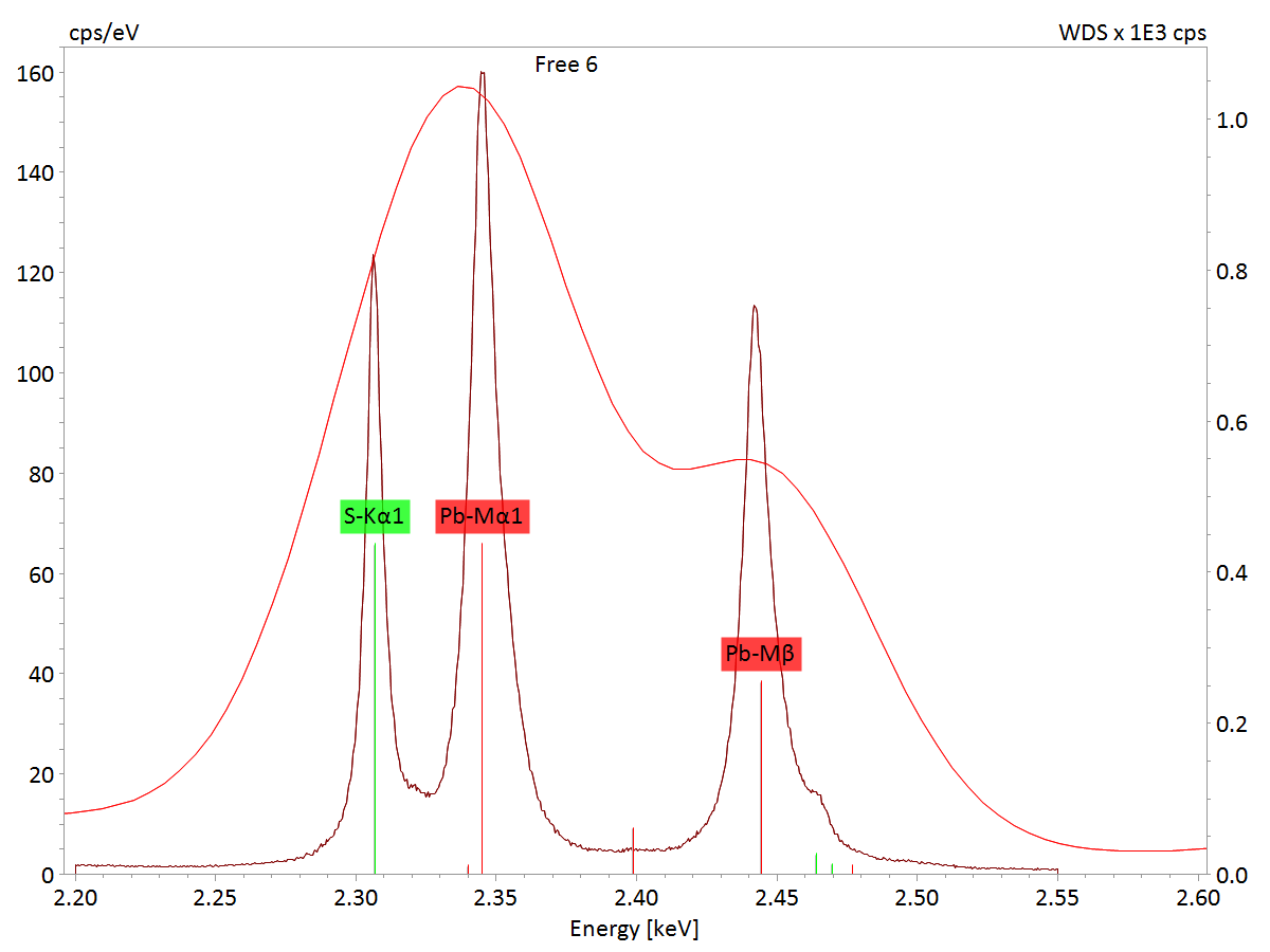 QUANTAX WDS es una potente herramienta analítica que bien puede resolver solapamientos de rayos X de Pb y S y por lo tanto determinar la naturaleza y la distribución espacial de las fases químicas generadas durante la alteración de la batería.