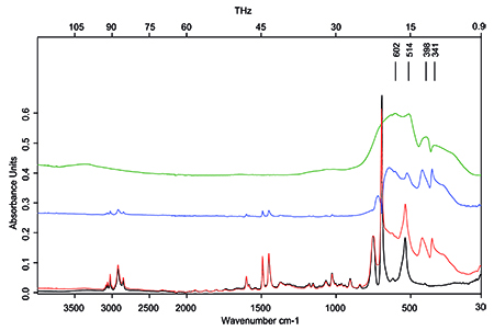 La región espectral FIR/THz juega un papel muy importante para el estudio de sustancias inorgánicas que implican vibraciones de átomos más pesados, ya que muchas de sus bandas características se encuentran por debajo de 400 cm-1. Utilizando la tecnología FM de Bruker para los espectrómetros FT-IR de investigación VERTEX 70v e INVENIO R se pueden obtener espectros de IR lejano de alta calidad simultáneamente con espectros MIR estándar sin necesidad de cambiar ningún componente óptico.