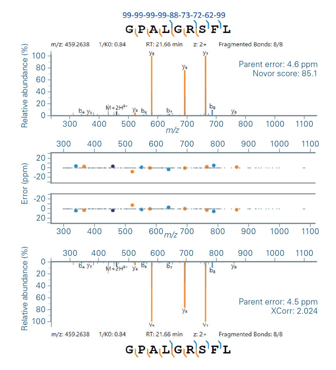 To further discoveries in immunopeptidomics, metaproteomics and other applications where de novo sequencing is needed, we developed BPS Novor together with Rapid Novor Inc.. Our solution provides the quickest, most accurate de novo sequencing results for timsTOF data with all the advantages of Run & Done.