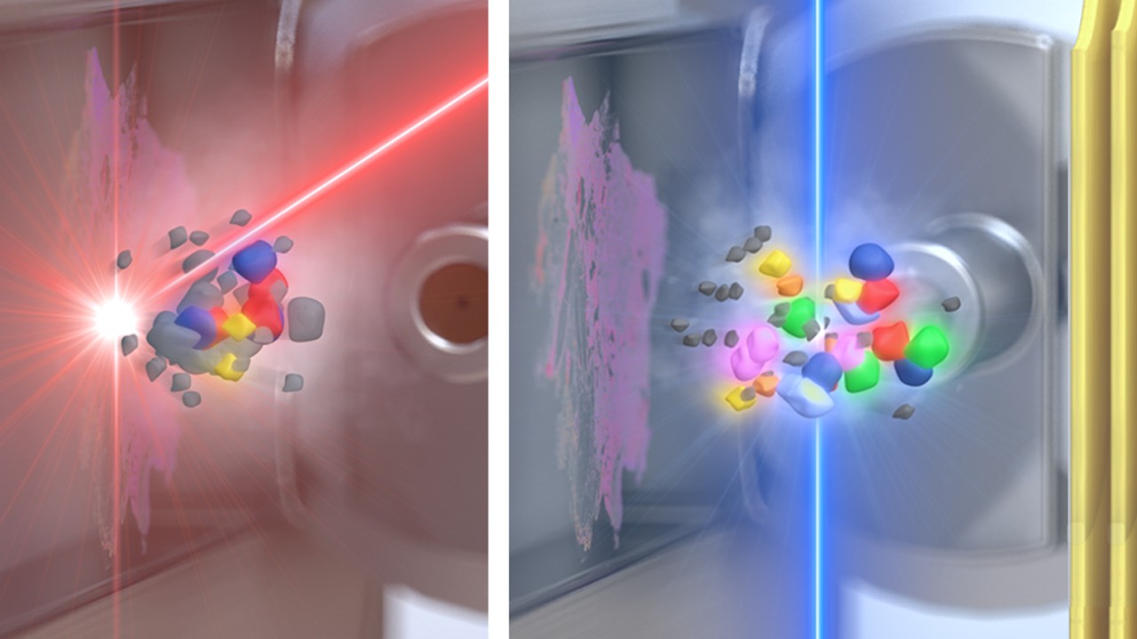 After the initial MALDI process, a second laser, sitting parallel to the sample surface, fires into the evolving plume and post-ionizes neutral (mainly matrix) molecules. A charge transfer from post-ionized matrix molecules to neutral analyte molecules leads to an amazing sensitivity gain for many analytes.