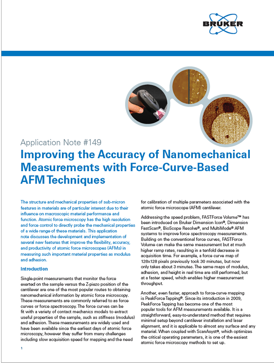 PeakForce QNM and FASTForce Volume provide convenient and highly productive force-curve-based platforms for nanomechanical measurements. Significant improvements have been made in the last few years to improve the flexibility, accuracy, and productivity of these important tools to measure material properties, such as modulus and adhesion. Bruker AFMs now feature new and easy-to-follow calibration steps combined with pre-calibrated, well-defined AFM tips for superior accuracy in measurements. New software capabilities in modeling and analysis expand the utility of the measurement to a wide variety of samples. Finally, probing the various properties as a function of frequency is now possible over a wide range, broadening horizons to fully explore properties of viscoelastic materials.