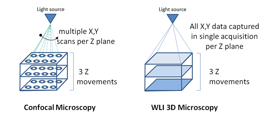 Confocal microscopes typically achieve data acquisition speeds on the order of 0.3 megapixels per second, in units of sections, or images. In order to achieve higher speeds with a confocal microscope the field of view must be reduced (e.g., for greater than 10 microns per second, a single line profile must be taken rather than a whole image). 3D microscopes based on WLI, on the other hand, provide scan speeds up to 100 microns per second vertically, with the entire field of view imaged in a fraction of a second. To illustrate this point, Table 1 compares best resolution data estimates for equivalent inspection areas measured by LSCM and WLI-based 3D microscopes.