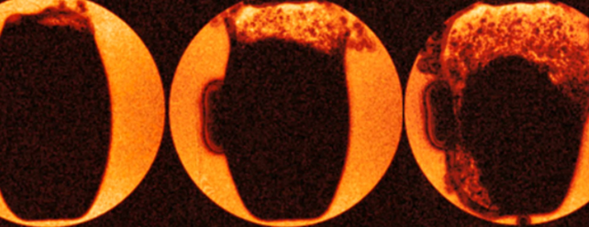 Behaviour of a tablet as water diffuses through the outer shell. The rapid “explosion” of the tablet starts in the top right-hand corner of this image and indicates that there might be a fault in the coating in that location. The “artefact” to the left was caused by paramagnetic components in a label stamped into the tablet and located in that area.