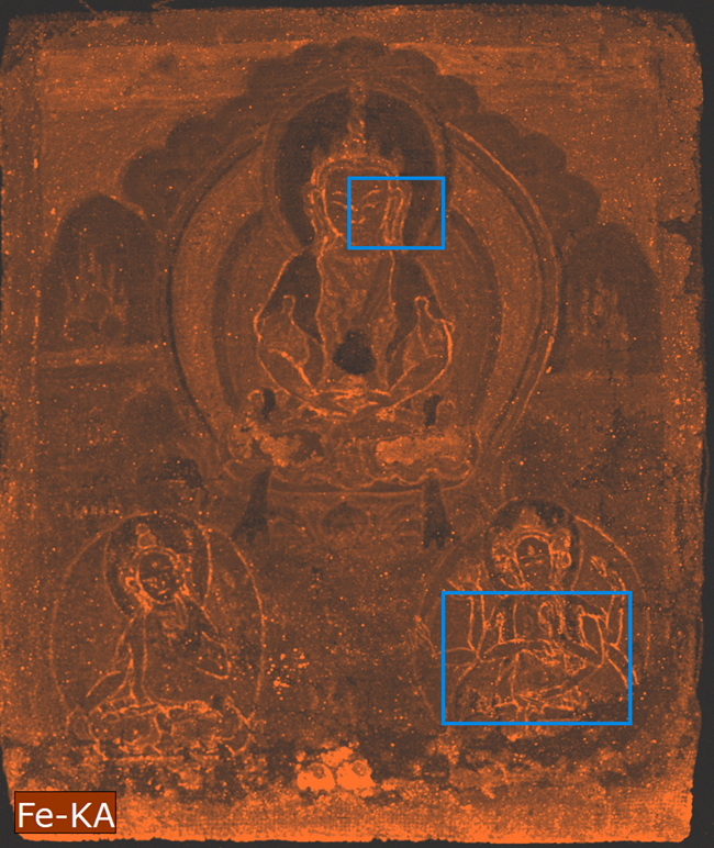 Fig. 3: Fe-Kα distribution showing the drawing stage of the three figures depicted. In the case of the smaller figures, these red ochre lines are still clearly visible and integrated into the final depiction, while the compositional drawing of the Buddha is covered by a more complex paint application that testifies to the higher importance of this figure.