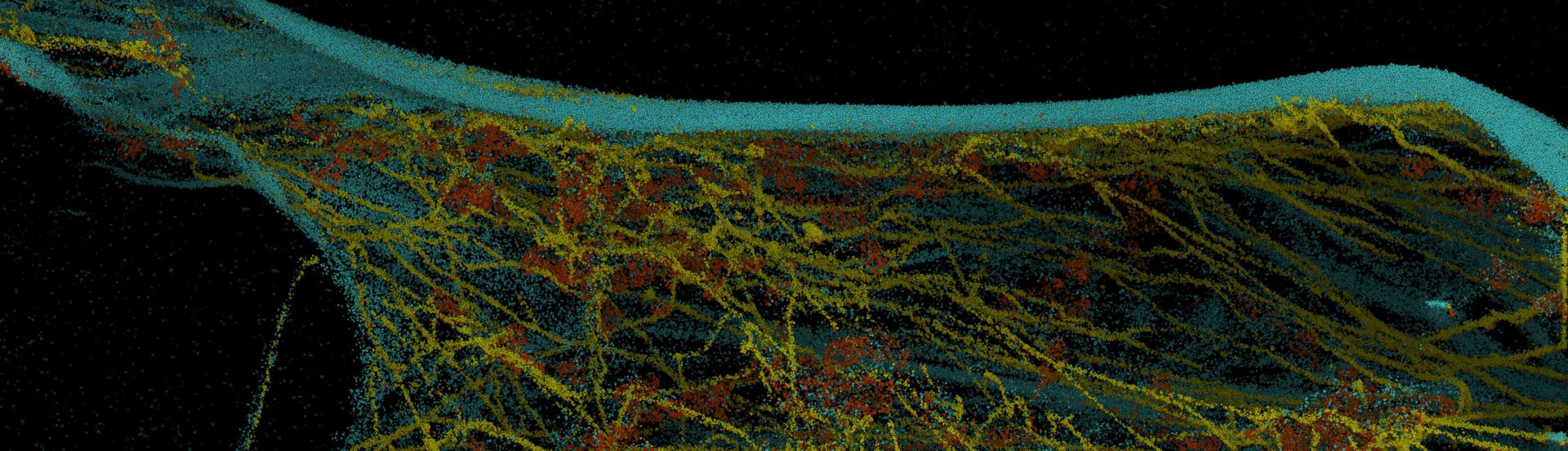 Here, a two-color DNA-PAINT experiment was performed on the Vutara single-molecule localization microscope. Tubulin is labeled in cyan and clathrin in magenta. Furthermore, due to the unbleachable nature of DNA-PAINT large Z-stacks are possible.