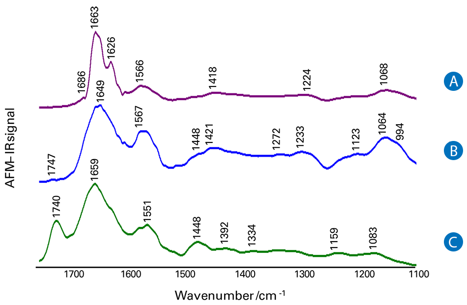 In a study by Ramer et al., nanoscale polypeptide conformational analysis in aqueous environments was performed.7 Proteins typically function by folding into three-dimensional structures and binding to other molecules to form functional complexes. IR spectroscopy is well established as an important tool for chemically characterizing the secondary structure of proteins both in aqueous and solid states. However, traditional IR spectroscopy is diffraction-limited to a resolution of 3-10 μm laterally, so nanoscale protein structures previously could not have been chemically analyzed. The nanoscale chemical characterization capability of AFM-IR spectroscopy has enabled the determination of polypeptide conformations in single protein fibrils and other submicron-sized protein structures, resulting in an improved understanding of important processes as protein misfolding and aggregation mechanisms.