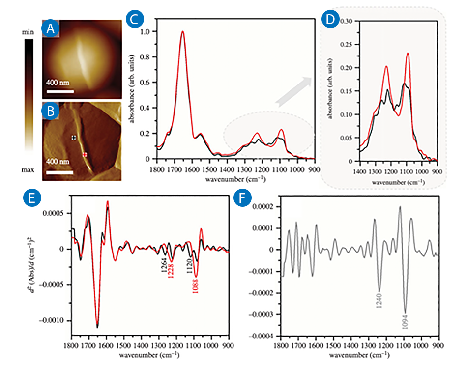 In a study by Kochan et al., AFM-IR spectroscopy was used to monitor nanoscale molecular changes in the cell wall during cell division in the bacteria Staphylococcus aureus.9 Dynamic changes in the cell wall during cell division in Staphylococcus aureus included the thickening of the septum and change in molecular components (Figure 4). The diameter of the newly forming septum was approximately 45 nm. The AFM-IR spectrum recorded from this structure clearly exhibit broadening and increased intensity of some bands (centered at 1088 and 1228 cm-1 and attributed to carbohydrate and phosphodiester groups of cell-wall components), when compared with a spectrum from an area outside the septum. The second derivative of a differential spectrum, obtained by subtraction of a non-septum spectrum from the septum spectrum, exhibits bands centered at 1092 and 1240 cm-1 (carbohydrate and phosphodiester modes). The chemical characterization of the septum structure at such high resolution in a live cell is uniquely possible with AFM-IR. This example demonstrates the capability of AFM-IR as a tool to gain molecular insights into cellular processes in vivo and in nanoscale detail.