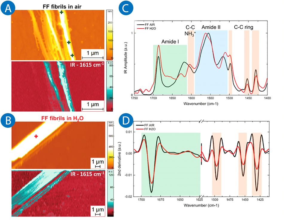 Figure 2. AFM-IR measurement of diphenylalanine (FF) fibrils in air and H2O. morphology and IR absorption map (1615 cm−1) for FF fibrils in (A) air and (B) H2O. (C) Comparison of the average AFM-IR spectra covering the amide I band (green), amide II (blue), and C−C ring (orange) spectral regions. (D) Comparison of the second derivatives of the spectra in the amide band I and C−C ring absorption. Adapted from G. Ramer, F.S. Ruggeri, A. Levin, T.P.J. Knowles, and A. Centrone, ACS Nano 12, 6612−6619 (2018).7