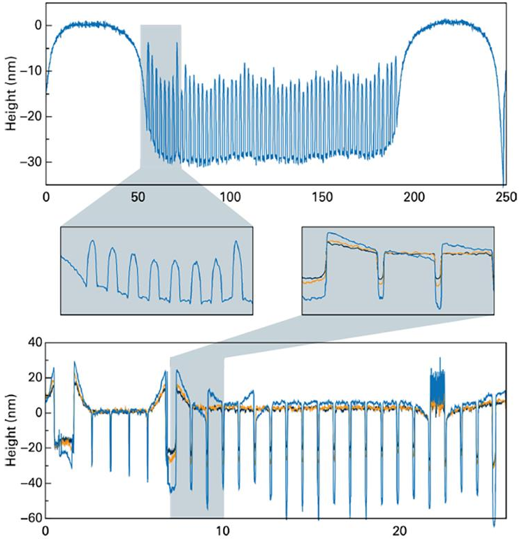Image: Post-CMP profiling (2nm data spacing) with high repeatability for both dishing (3σ = 0.14nm) and erosion metrology (3σ = 0.32nm).
