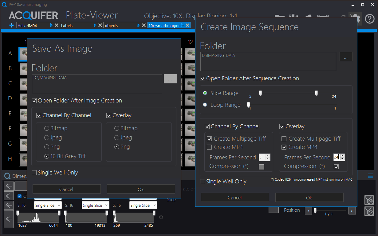 The Plate-Viewer visualization software utilizes data acquired with the Acquifer IM high-throughput screening microscope. The user interface and design allow for intuitive working with datasets, such as overviews of screening data, inspection of individual images and functionalities to adjust channels-display, save data visualizations or time-lapse movies.