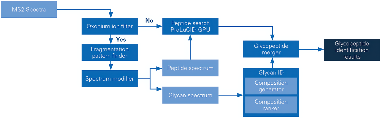 The Myriad workflow was first described by Armony et. al. (https://doi.org/10.3390/ijms24097869). The workflow effectively decomposes glycopeptide fragmentation spectra into peptide and glycan moiety spectra using common N-glycan fragments. Each moiety is then identified by a specialized real-time algorithm after which the glycopeptide is “reassembled”. A significant advantage of the Myriad workflow is that it does not require any glycan database(s), enabling the identification of glycans not in the database(s) and minimizes false negatives.