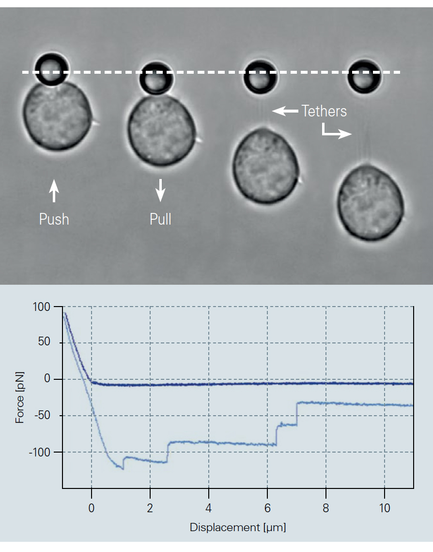 As well as applying and measuring forces, NanoTracker 2 can be used to manipulate cells directly with optical traps: