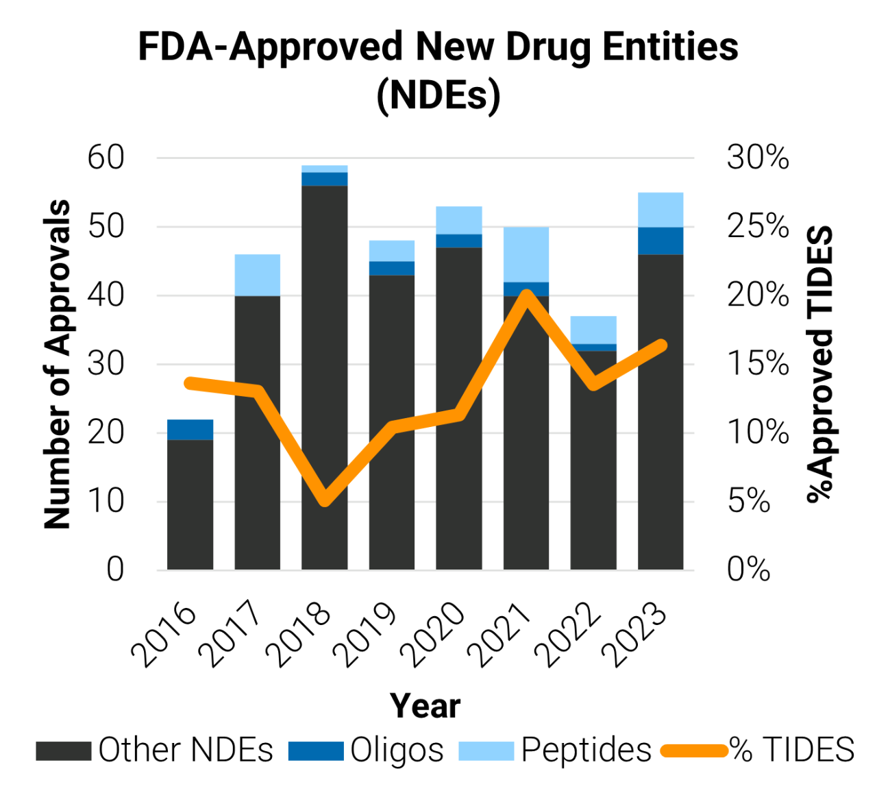 TIDES have recently emerged as valuable therapeutic candidates due to their versatility and precision in targeting various diseases, such as diabetes, cancer, osteoporosis, cardiovascular diseases, genetic disorders, and several rare diseases. The benefits of TIDES as therapeutics include target specificity, patient safety, drug efficacy, druggable indications, and low costs, which has led to an increase of FDA approvals over the past decade.