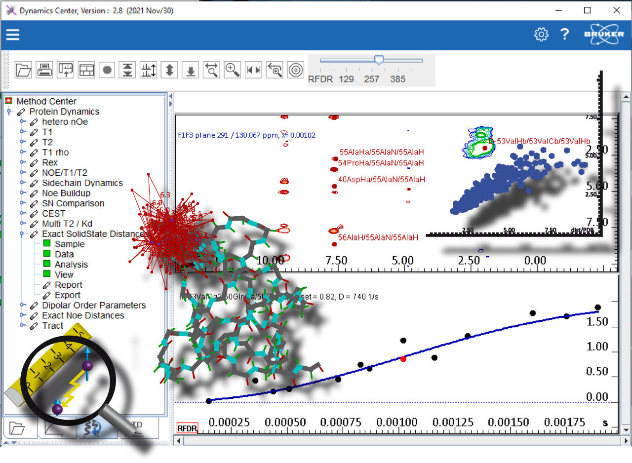 Dynamics Center is a unique comprehensive software solution for relaxation, diffusion, and kinetics analyses. It offers a rich collection of methods especially in protein and nucleotide applications. The analysis of NMR data containing one or two non-frequency dimensions is performed automated or semi-automated.
