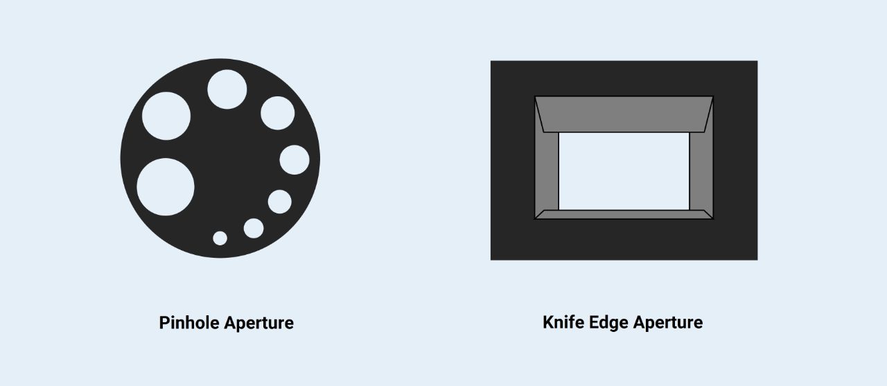 A pinhole aperture is the simplest and cheapest option. It consists of a wheel with circular apertures of various sizes. The wheel is simply turned to select the aperture size that is best suited for that experiment. Knife edge apertures are more expensive, but much more precise.