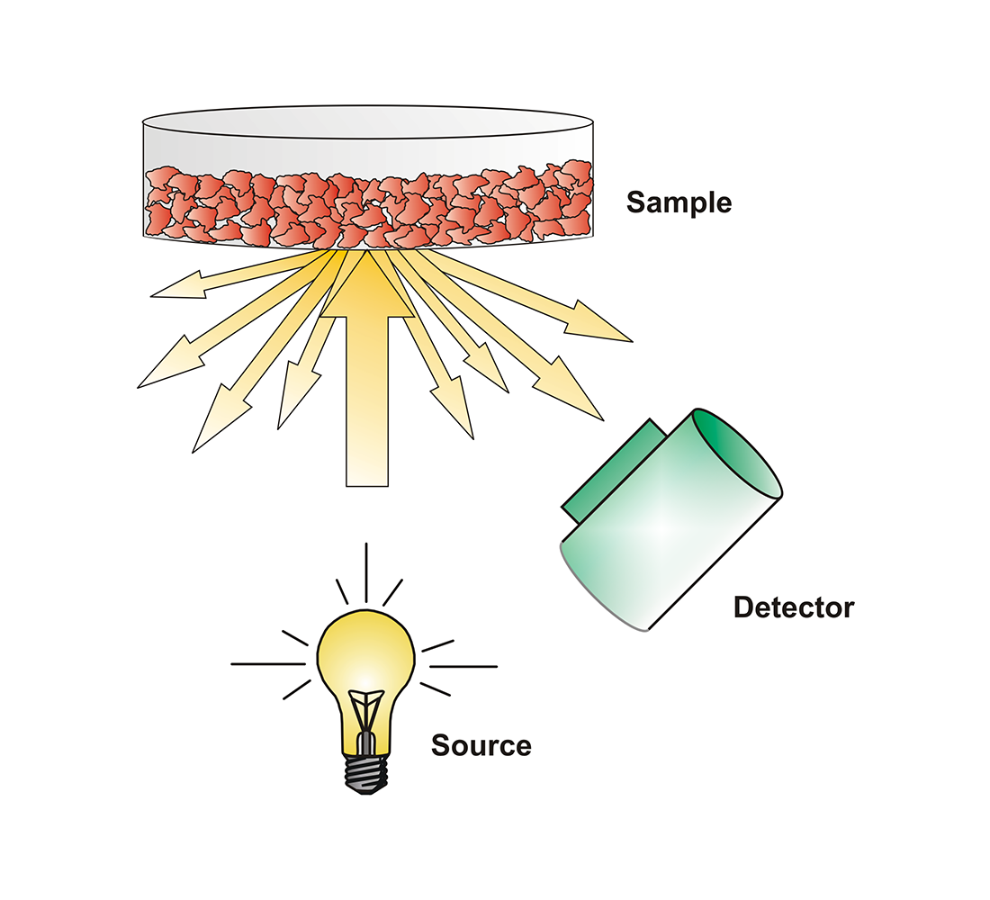 光が固体表面や粉体、ペレット、顆粒などの粒子から反射することを拡散反射といいます。積分球では、光はほぼ平行に近い広いビームで試料に照射されます。拡散反射された光は、金メッキされた内面で拡散反射を繰り返すことで球内に広く分布し、「均一化」されます。 そのため、積分球は微粉末だけでなく、不均一な試料にも適しています。試料にもよりますが、光は表面からかなりの距離まで透過します。例えば、粉体の場合、粒径、波長、密度にもよりますが、約2~4mmの距離まで透過するため、試料中の成分を定量することができます。