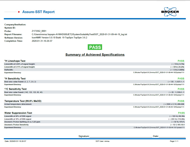 AssureSSTは、感度や分解能を調べて、装置が1Hや13Cなどの核種で仕様を満たす性能を発揮していることを確認します。利便性を向上するために、このテストではサンプルチェンジャーに常時セットされているサンプルを使用してIconNMRから測定を実行します。 ユーザーは、テストサンプルのホルダー位置を指定し、実行するテストを指定し、合格/不合格の要件を設定して、テストをスケジュールするだけです。