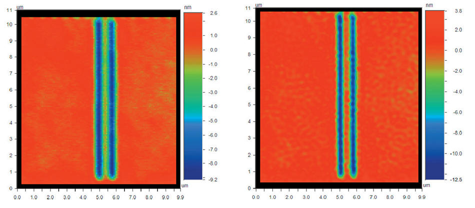 Bruker’s exclusive AcuityXR™ enhancement for ContourGT 3D optical microscopes uses an algorithm to reconstruct the object that has been imaged by an optical system free of diffraction. Through multiple scans and system modeling, AcuityXR produces a measurement with twice the number of pixels in both the X and Y directions than is possible with a standard interferometric measurement. AcuityXR utilizes a patent-pending iterative technique with feedback from the metrology hardware to systematically reduce system noise and mitigate blurring effects caused by diffraction on the final calculated surface height. Features at 130 to 500 nanometers on smooth or stepped surfaces can be resolved by the use of an interferometric measurement mode on a WLI 3D microscope that resolves greater surface detail without compromising the many other benefits of these systems. Figure 5 compares a measurement taken with a standard WLI 3D microscope (left) with one taken with a WLI 3D microscope plus ActuityXR enhancement (right). In the image on the right, enough resolution is gained to reveal the full separation between the lines, and fine details of the linewidth variation are visible.
