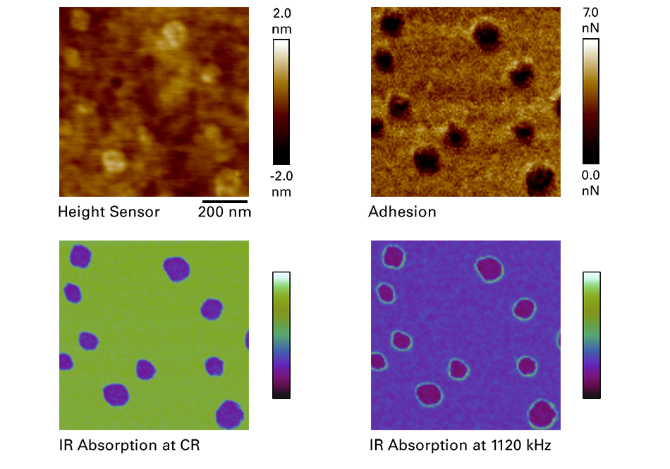 Figure 1. Simultaneous multimodal imaging (height, adhesion, and IR absorption) enabled by REFV AFM-IR.
