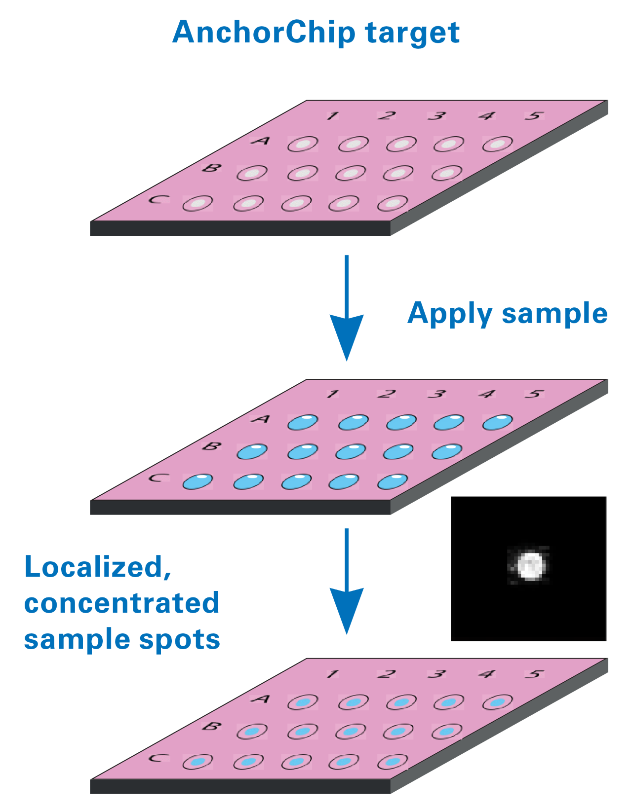 Sample positions on patented Bruker AnchorChip targets contain “anchors” – hydrophilic patches surrounded by a hydrophobic ring. The “anchor” localizes droplets and ensures that every single laser shot fired throughout an automatic run will hit a sample spot.