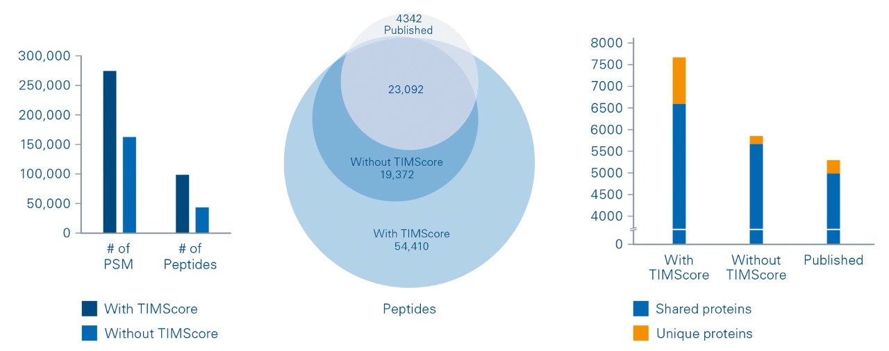 TIMScore™ provides the greatest number of PSM, peptide and protein identifications by enabling the CCS dimension for true 4D-Proteomics™.