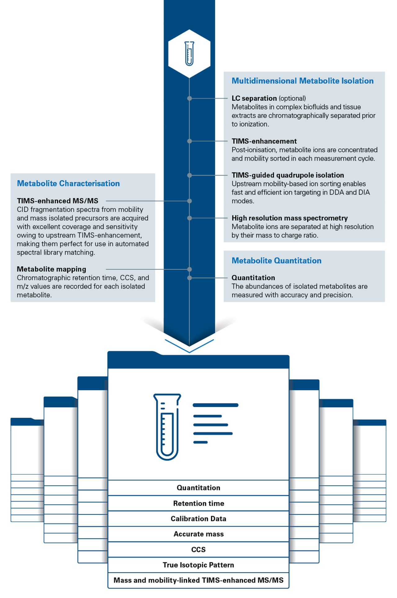 The timsMetabo™ enables simultaneous quantitation and characterisation of the analytes within each sample analysis, virtually eliminating the need for re-acquisition. timsMetabo™ data enable confident analysis and annotation, and are well suited for AI in metabolomics with machine learning from large-scale, high-quality data sets.