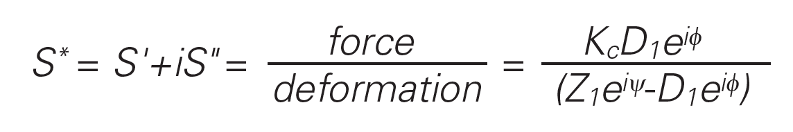 Separating the real and imaginary parts of equation 3 results in the storage stiffness (real) and loss stiffness (imaginary) components. The loss tangent (tan d) is simply the ratio of the two: