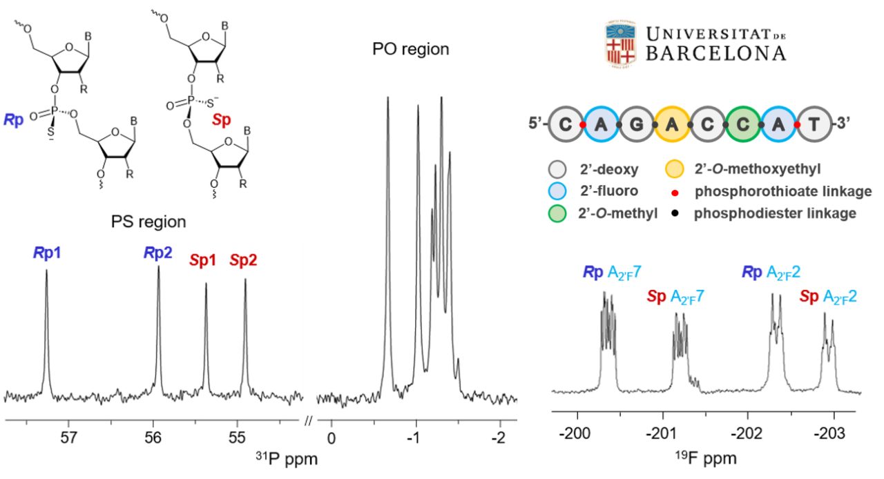 There is an increasing demand from the pharmaceutical industry and regulatory agencies for analytical methods capable of accurately characterizing therapeutic oligonucleotides, which often contain chemically modified nucleotides to increase their biostability and bioavailability. The CP-MNI probe allows time-efficient assignment of the 1H, 13C, 31P, and 19F signals of such oligonucleotides, the confirmation of their primary structure, as well as the identification and quantification of all the diastereomers.