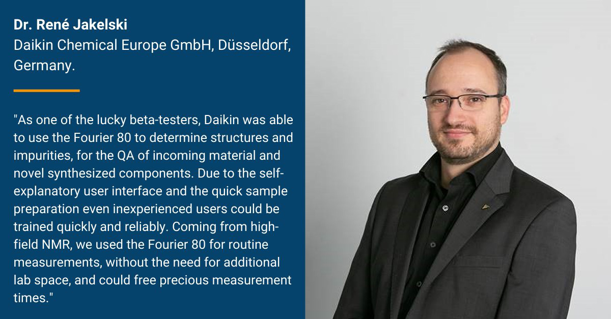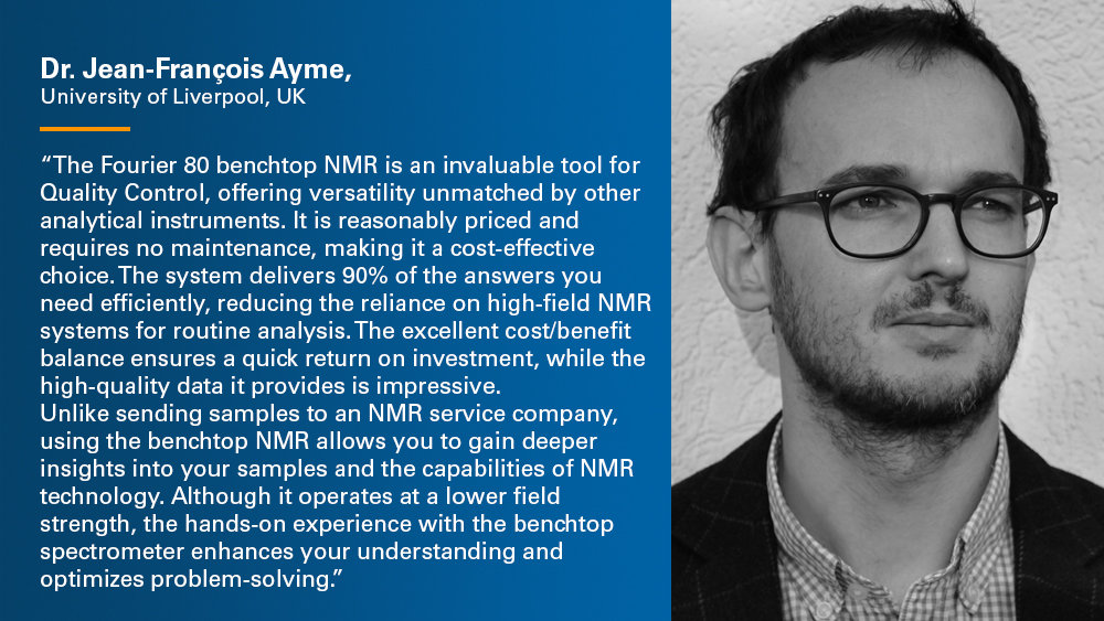 The Fourier 80 benchtop NMR spectrometer is compact, cost-efficient, and user-friendly, fitting on a regular laboratory bench without requiring special infrastructure. It provides high-quality data for structure verification, reaction monitoring, and process control, helping chemists optimize synthesis and ensure product quality. Its intuitive software facilitates data acquisition and interpretation, enhancing productivity and efficiency in chemical research and development. Discover how the Fourier 80 can support your chemical processes and innovations.