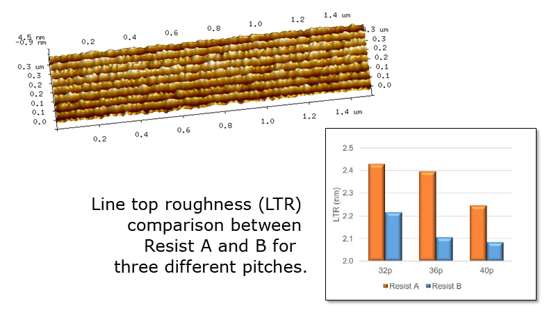 The transition to EUV lithography has brought with it a number of new metrology metrics that must be monitored. One of these new metrics is Top Line Roughness (LTR). LTR does correlate with defectivity and yield results for the two resists discussed here. The resist with lower LTR (by 9% on average) develops significantly less line break defects and shows much better yield (Resist B). Therefore, LTR analyses post development may be used for early screenings of new resist formulations and help to forecast pitch- and dose-dependent performance as well as allow for yield predictions. The InSight AFP’s TrueSense™ mode provides the highest resolution AFM image for non-destructive Top Line Roughness EUV process monitoring