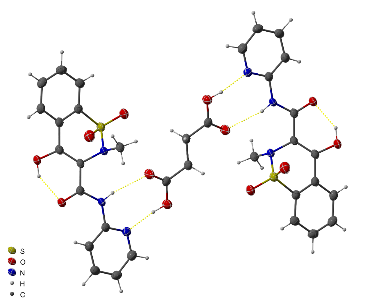 Figure 4: Absolute structure of piroxicam-succinate at atomic resolution. SC-XRD unambiguously confirms the API chirality and provides details of intermolecular interactions.
