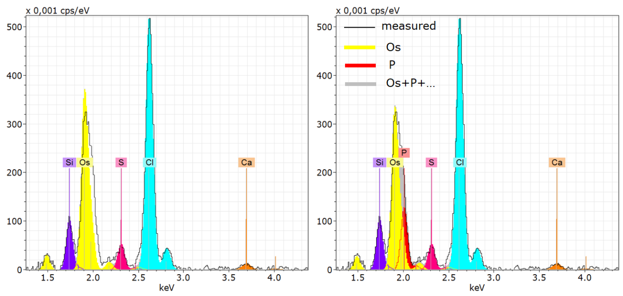 As an example, resin embedded human erythrocytes infected with Plasmodium falciparum, the Malaria causing parasite, were investigated using EDX in a standard STEM. The element distribution was mapped and analyzed quantitatively (Fig. 1). Peak overlaps such as of osmium, used for staining, and the lighter phosphorous can be easily separated using the versatile and very open EDS analysis software ESPRIT. Fig. 2 shows that the inclusion of phosphorous overlapping with osmium is essential for the correct representation of the measured spectrum. Furthermore, the calcium peak, used for mapping clearly appears in the background subtracted spectrum.