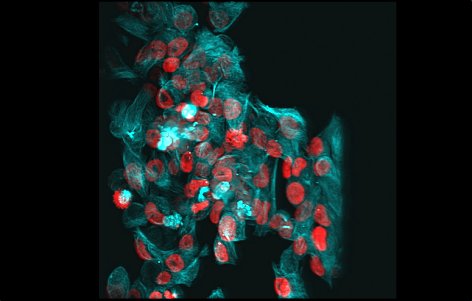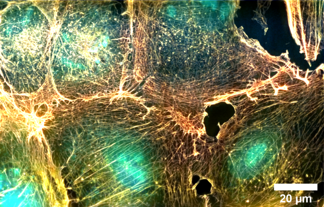 Epithelial cell line (BS-C-1) stained for f-actin and chromatin. Image taken with InVi SPIM Lattice Pro.