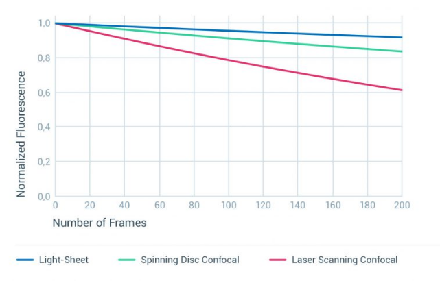 Comparing light-sheet, spinning disk, and confocal microscopy rates reveals a lower photobleaching rate with light-sheet microscopy.
