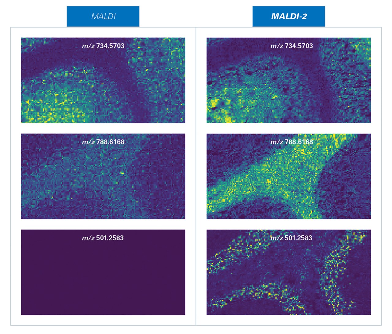 to tissue models by pinpointing the exact location of drugs and metabolites in tissue. MALDI-2 enhances molecular imaging for pharma studies by increasing overall sensitivity enabling quantitation for a wider range of dosing levels. Additionally, the increased variety of molecular classes seen by MALDI-2 expands the applicability of imaging to many more pharma projects that involve both xenobiotics and endogenous molecules.
