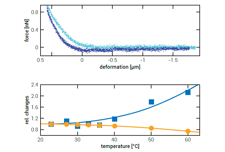 The top image shows the corresponding QI force curve., the bottom curve shows the increase in Young’s modulus (blue) and decrease in size (orange) with increasing temperature. Sample courtesy of Prof. De Laporte, Aachen (Germany).