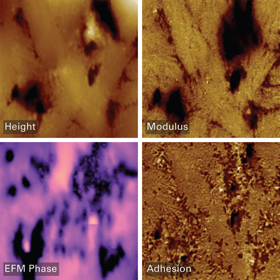In PeakForce EFM, the capabilities of EFM and PeakForce QNM are combined. PeakForce EFM provides simultaneous acquisition of topography, electric field distribution, and mechanical properties, such as adhesion, modulus, and deformation.
