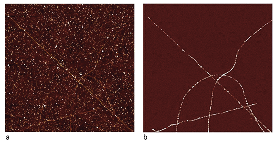 Figure 11. PeakForce TUNA images (a) topography (b) current map of carbon nanotubes lying flat on a SiO2/Si sample. Images were taken on Bruker’s Dimension® Icon® AFM in ambient conditions, with an SCM-PIT probe (spring constant ~4N/m), 5µm scan at a DC sample bias of 500mV. Sample courtesy of Prof. Hague, Rice University.